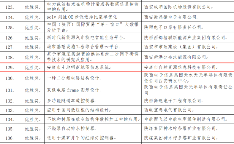 近日,由陜西省科學技術協會、陜西省工業和信息化廳、陜西省人民政府國有資產監督管理委員會、陜西省工商業聯合會共同主辦的2023年陜西省企業“三新三小”創新競賽結果出爐。公司參賽項目《安康市土地招商地圖信息系統》通過初賽、決賽評審等環節榮獲優勝獎。